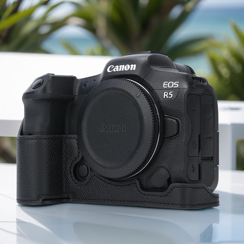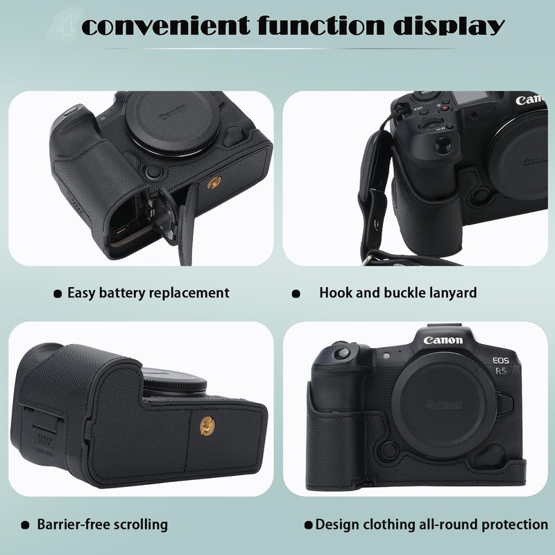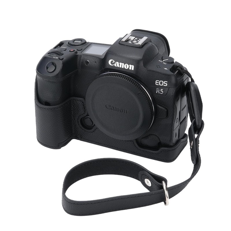 - It has a special design for Canon EOS R5 Camera which makes it easy to turn over the Screen and it will totally not affect screen rotation. You don't need to take off the half case when you connect data lines. It has a special design for Canon EOS R5 Camera which makes it easy to turn over the Screen and it will totally not affect screen rotation. You don't need to take off the half case when you connect data lines.