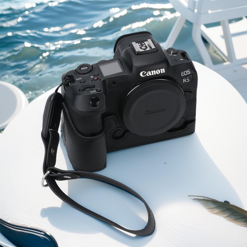 for Canon EOS R5 Camera Case,Handmade Genuine Real Leather Half Camera Case Bag Cover for Canon EOS R5 Camera Bottom Opening Version + Hand Strap (Black)