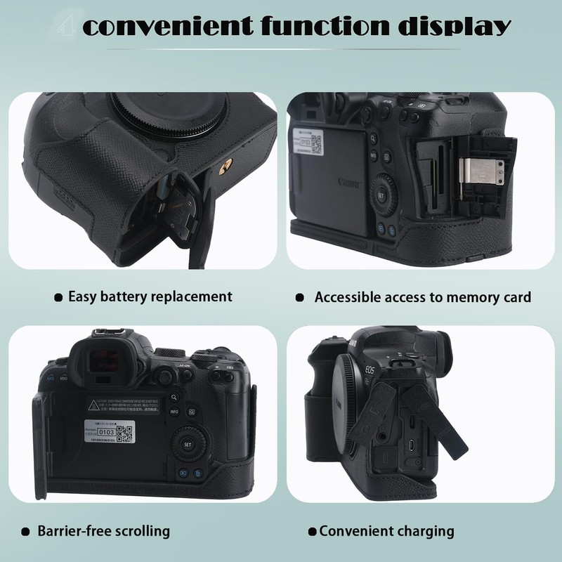• It has a special design for Canon EOS R6 Camera which makes it easy to turn over the Screen and it will totally not affect screen rotation. You don't need to take off the half case when you connect data lines. It has a special design for Canon EOS R6 Camera which makes it easy to turn over the Screen and it will totally not affect screen rotation. You don't need to take off the half case when you connect data lines.