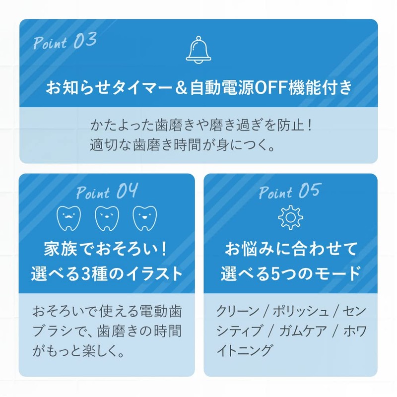 This sonic electric toothbrush can remove dirt from the gap between the teeth and the teeth and the circumference pocket in a short period of time than hand polishing. Equipped with 5 modes to suit your teeth problems, this device will provide you with a variety of oral problems. The "Notification Timer" and "Auto Power Off Function" allow you to wear the appropriate toothpaste time. Sumanu-chan (Kids) comes with a small size (kids) brush. The ultra fine soft brush has a curved shape and is designed to not scratch children's gums.