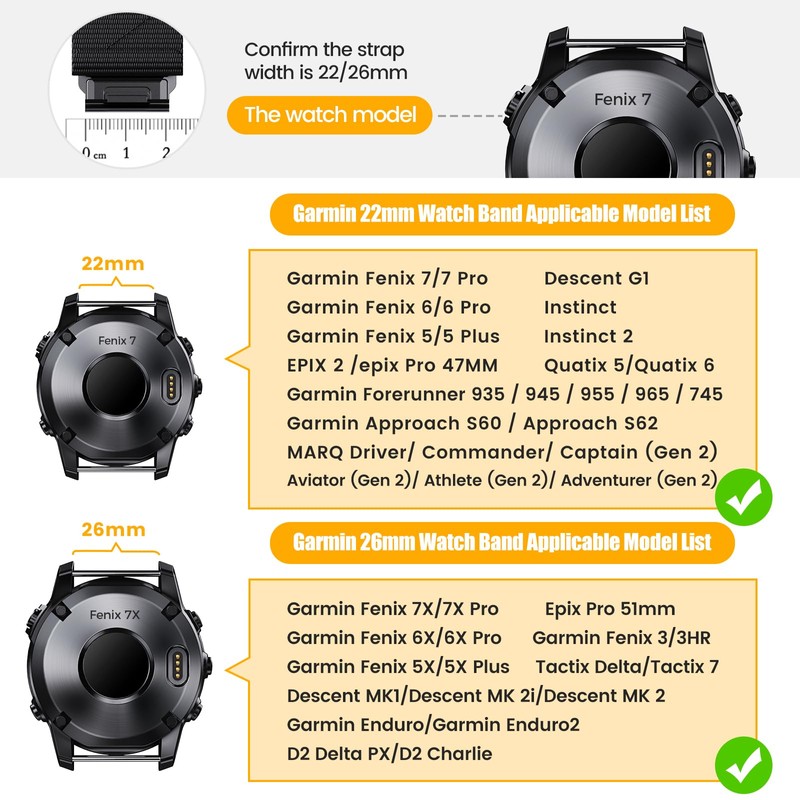 • 22 mm watch strap compatibility: Notocity 22 mm nylon strap compatible with Garmin Fenix 7, Fenix 6/6 Pro, Fenix 5/5 Plus, Forerunner 935/945/955/745, Garmin Approach S60/Approach S62, Descent G1, EPIX 2 N Quatix 5/Quatix 6, Inst. inct Crossover, MAR, MARQ Driver/Commander/Captain (Gen 2)/Aviator (Gen 2)/Athlete (Gen 2)/Adventurer (Gen 2)