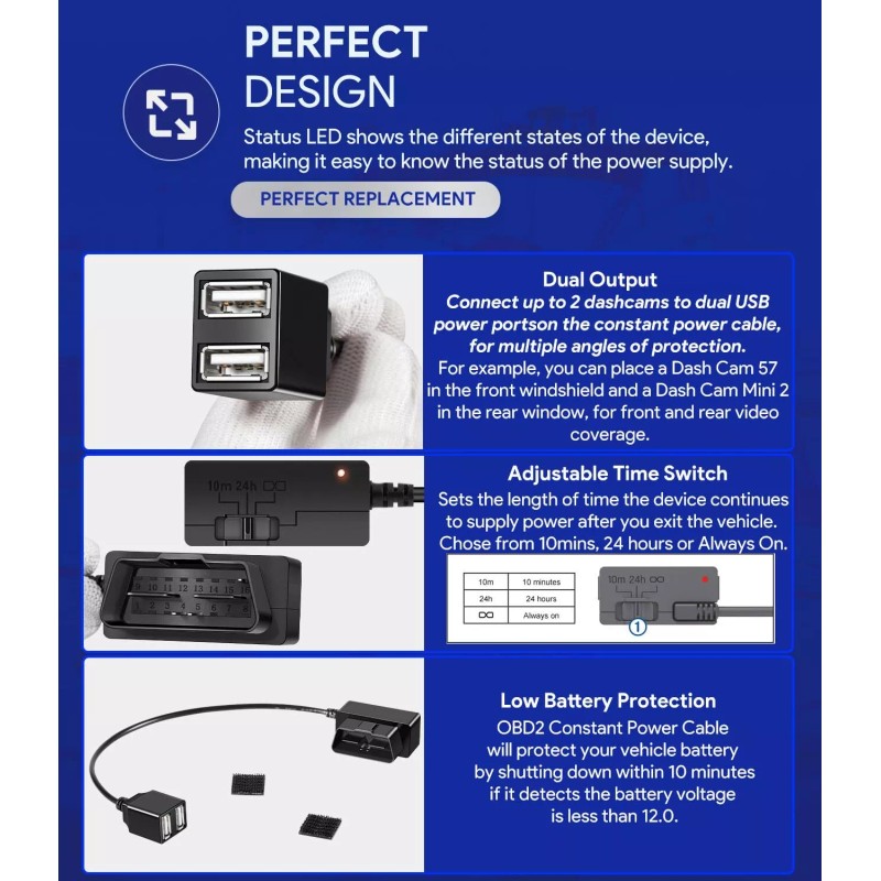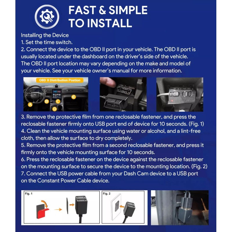 1) Once the cable is easily installed (simply "plug and play") into the vehicle's OBD-II diagnostic port, your compatible dash cam will receive power at all times, even when your vehicle is off, so you can rest easy. Enjoy 24/7 protection with the new OBD-II Constant Power Cable