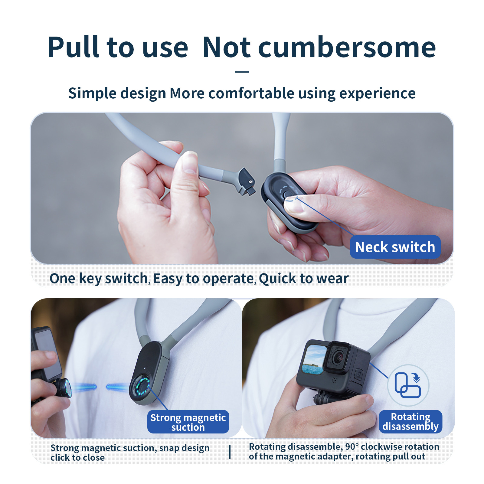 2.Free your hands. Quick release button helps you remove the neck hold mount. Magnetic rotating interface quick to wear and easy to install.