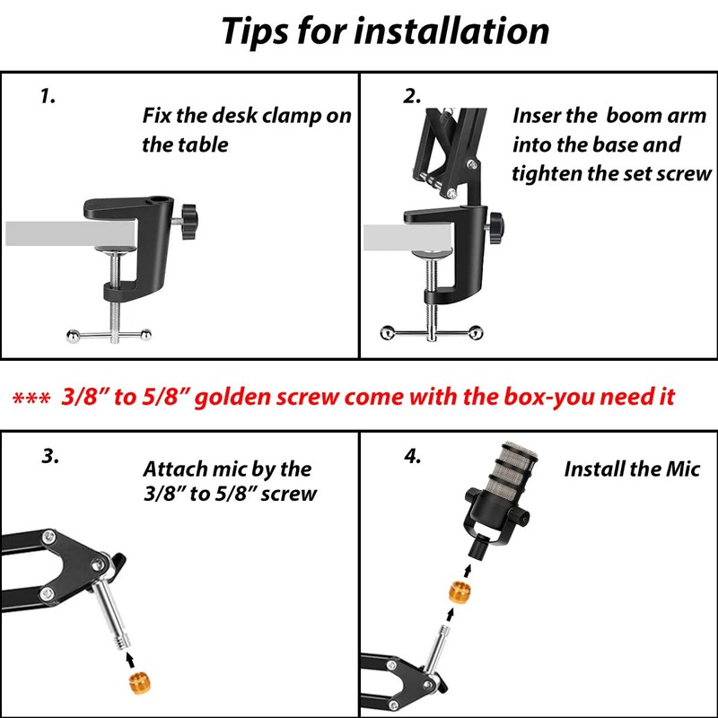- Various accessories: The set not includes rode podmic Microphone.The set includes 1 x rode podmic mic boom arm, 1 x Desk clamp, 1 x 3/8" to 5/8"Adapter, 3 x Cable tie.