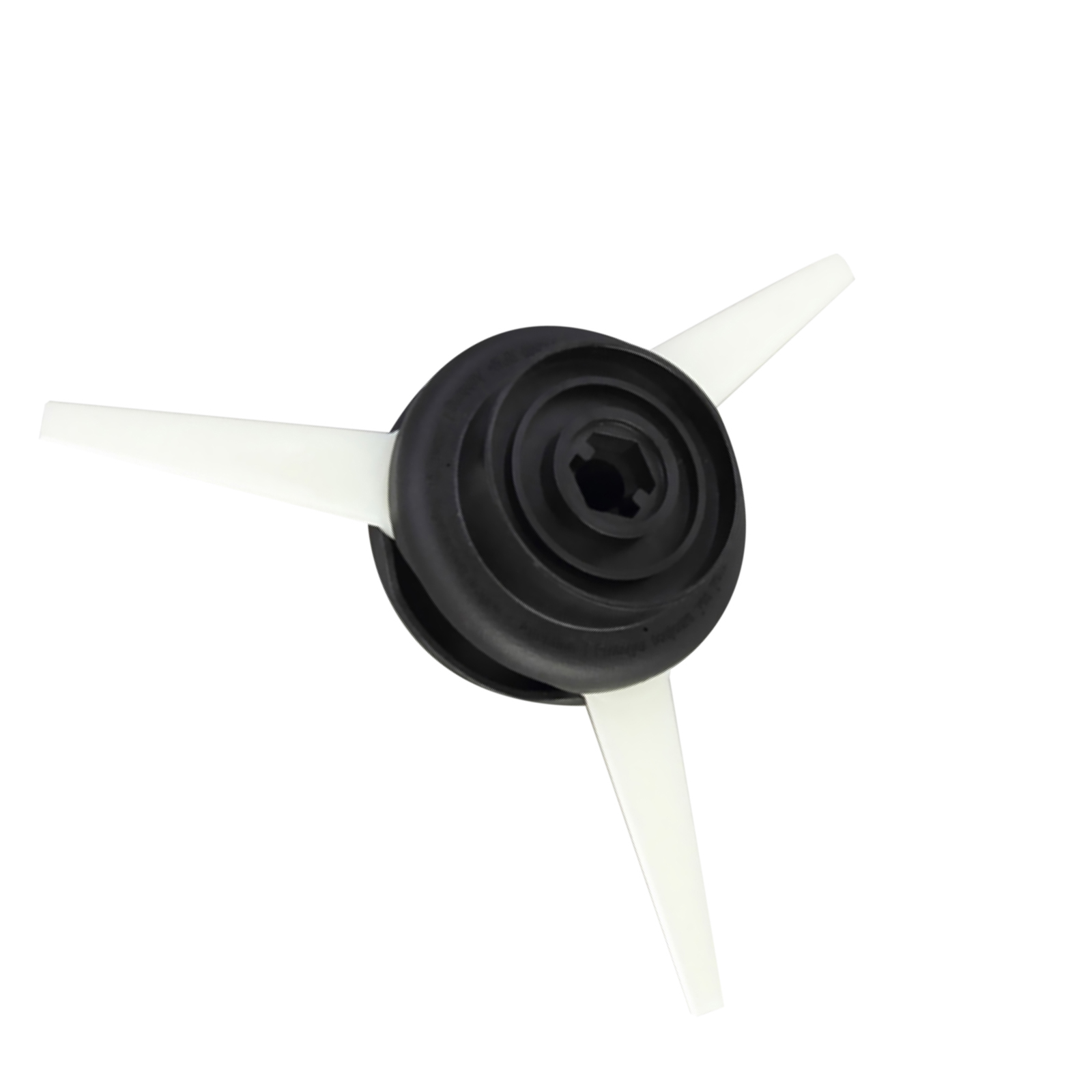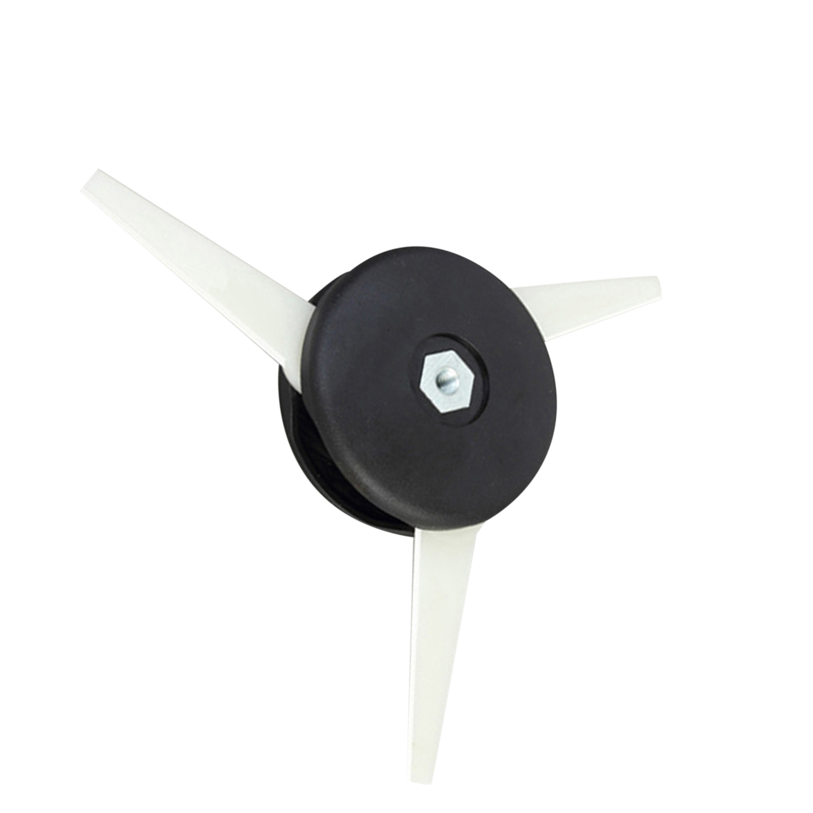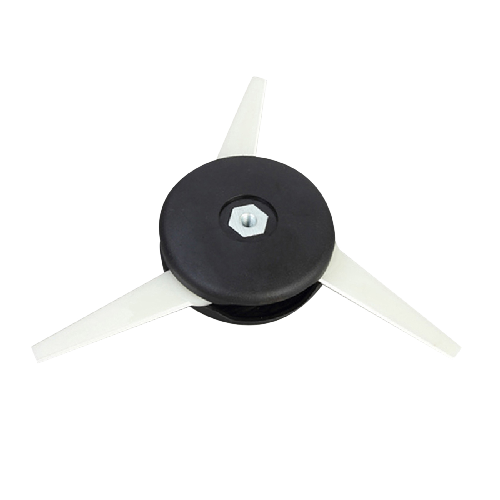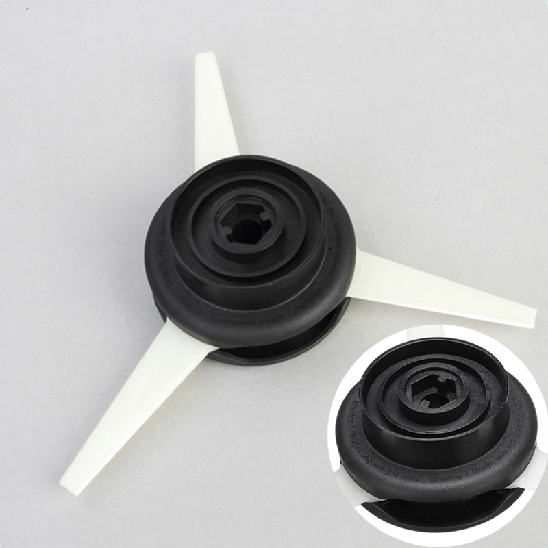 The trimmer head uses three replaceable blades for effective cutting performance.