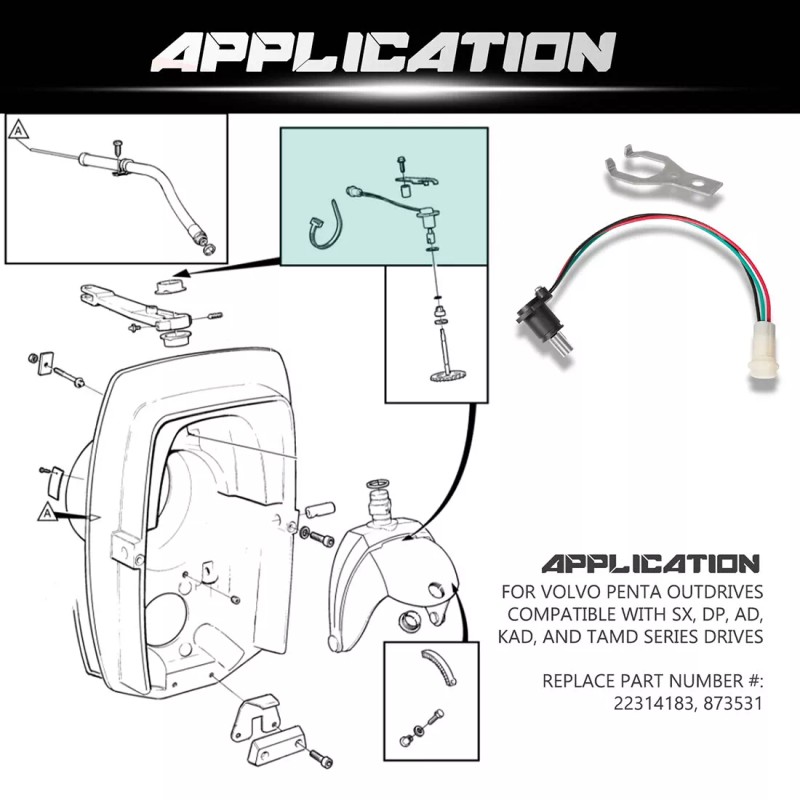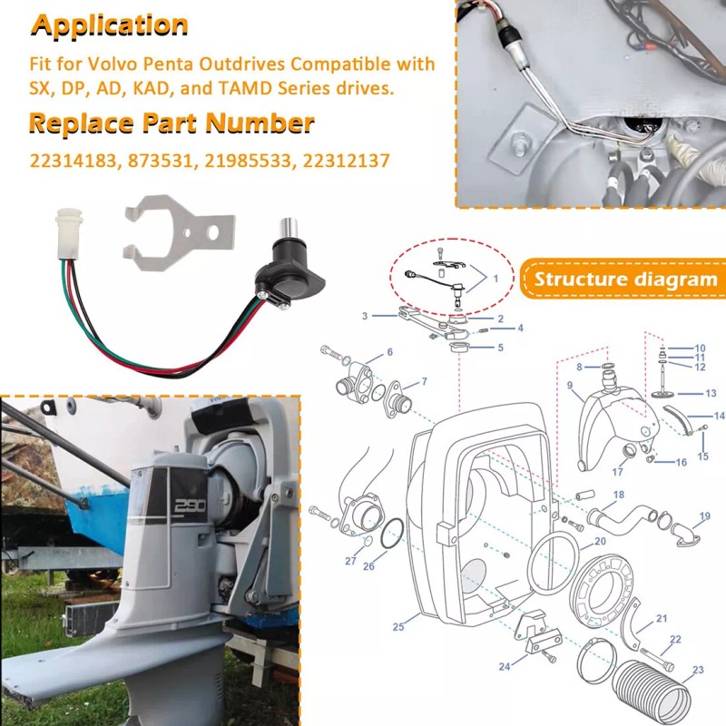 1) The potentiometer tilt trim sensor kit replaces volvo penta stern drives part number (MPN): 873531, 22314183, 21985533, 22312137. High quality aftermarket parts are compatible with AD, DP, SX, EF, BY, LK, KAD and TAMD series drives