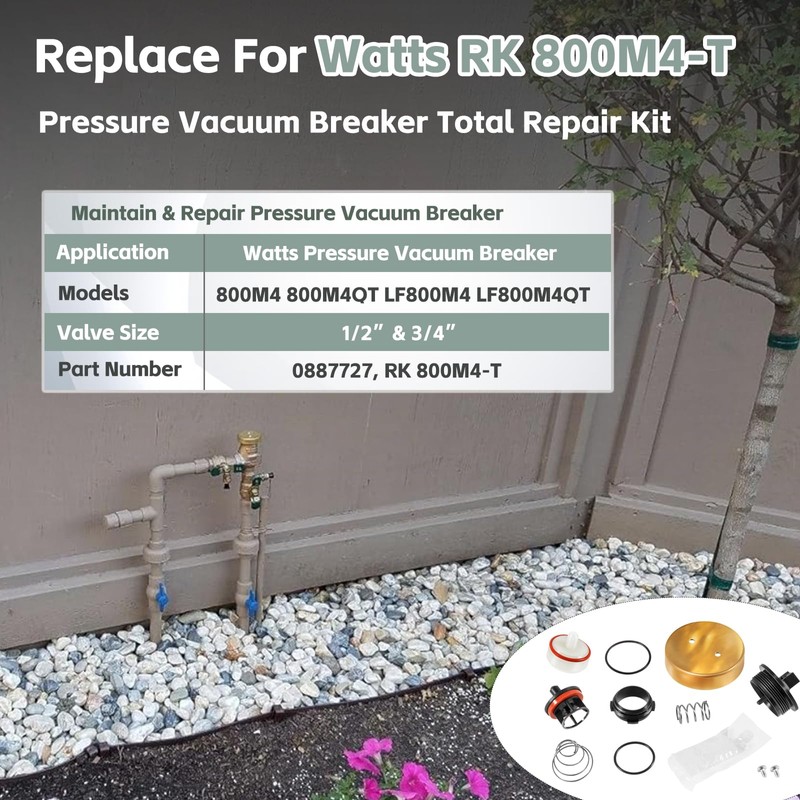 - 【Replacement For Watts 0887727 RK 800M4-T】 This PVB Total Repair Kit is specifically designed for 1/2” -3/4” Watts 800M4 and LF800M4 pressure vacuum breaker. For Watts 800M4 Repair Kit. For watts 800m4 qt 3/4 repair kit