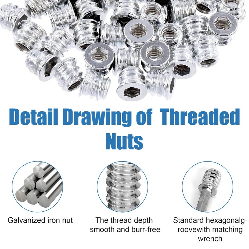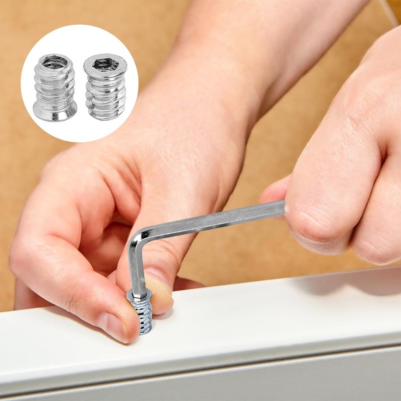 - Easy to use: First drill a hole of the correct size (the depth is 1-2 mm longer than the furniture screw) and then use the included hex key or other optional drive tool to assemble the nut (if the wood hardness is high, please enlarge the screw hole).