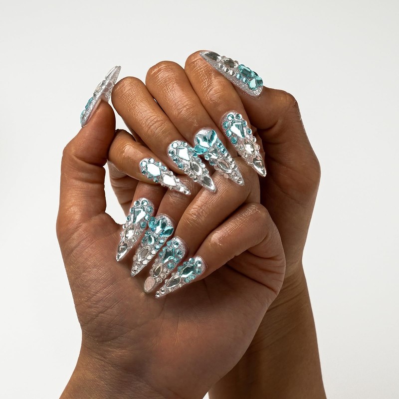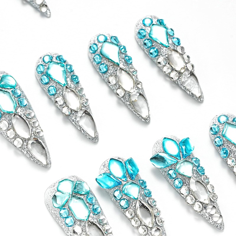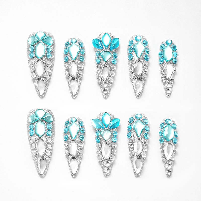 FORBELOVED NAILS,Luxury Silver-Blue Crystal Handmade Press On Nails,Long Stiletto Stick On Nails,Shiny Full Covered Gems,Charming False Nails For Women And Girls,10Pcs/Set With Glue,(Blue-L),FOB