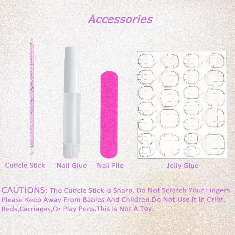 - Packaging:Each box includes:24 Pcs in 12 different nail sizes, storage box,cuticle stick,jelly adhesive tabs,nail glue, double-sided Nail file.Nails can be freely trimmed, shaped, and polished to create your desired look.