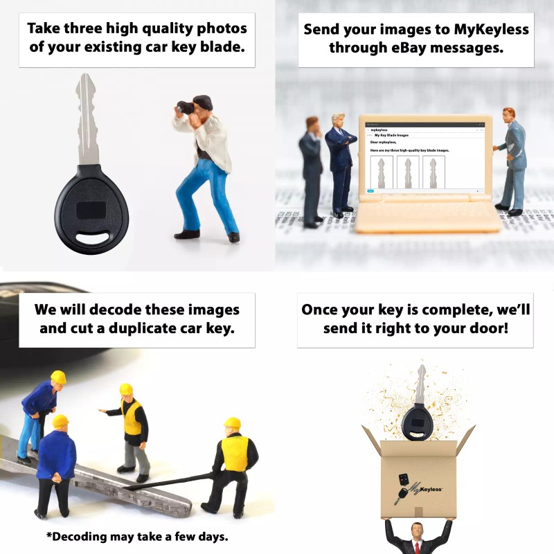 Using our unique key-decoding procedures, we are able to offer key cutting using only images of existing cut keys! Please be sure to read all the descriptive text below to understand what we need from you, in order to make this process simple and easy. PLEASE NOTE: Most items will still require the use of diagnostic equipment or tools for programming the key to your vehicle, in order for it to turn your ignition. These tools are commonly available at a local locksmith or dealer.