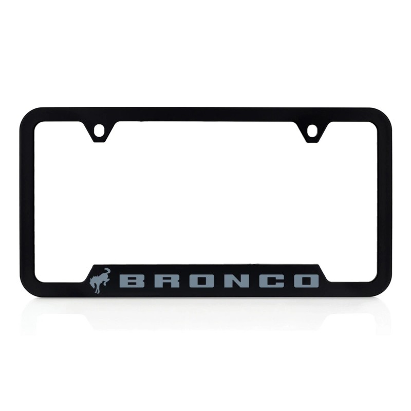 This Ford Bronco Plastic License Plate Frame Tag Holder is a Genuine Official Licensed Product. Features the Official Ford Bronco Horse Logo. The license frame measures 12 inches long and 6 inches tall and is designed to fit all standard issue DMV license plates. It can be used on either the Front or the Rear of the vehicle.