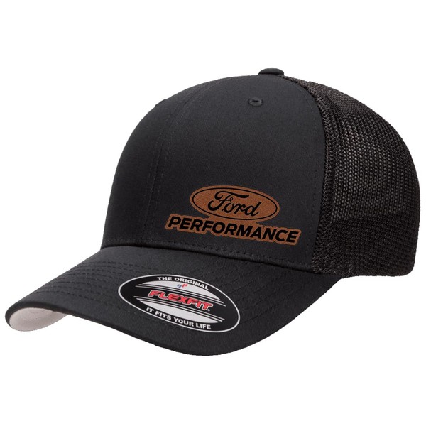 Ford Performance Side Logo Laser Engraved Leather Patch Flexfit 6511 Trucker Mesh Fitted Cap Black