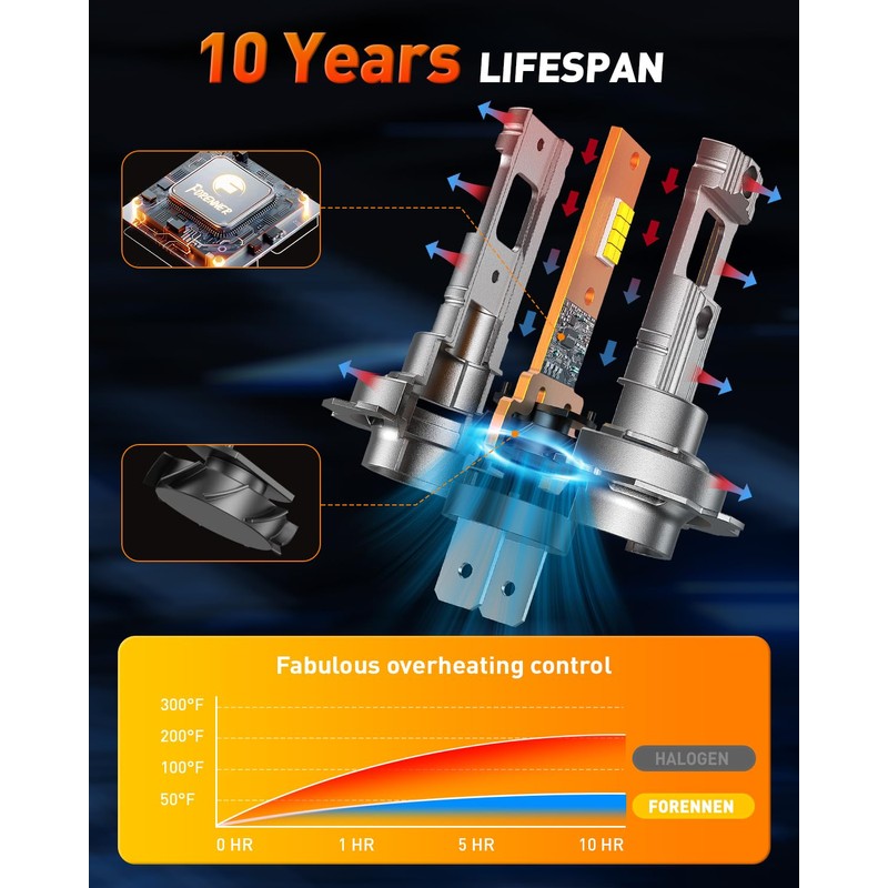 - 【Extensive 50,000-Hour Lifespan】 The forenner H7 bulbs are engineered with high-quality aviation-grade aluminum and equipped with a cold-pressed aluminum heat sink and a high-speed cooling fan running at 12,000 RPM. This advanced cooling system efficiently dissipates heat from the chip, guaranteeing an impressive lifespan of up to 50,000 hours. Enjoy reliable, long-lasting performance with fewer replacements and greater peace of mind.