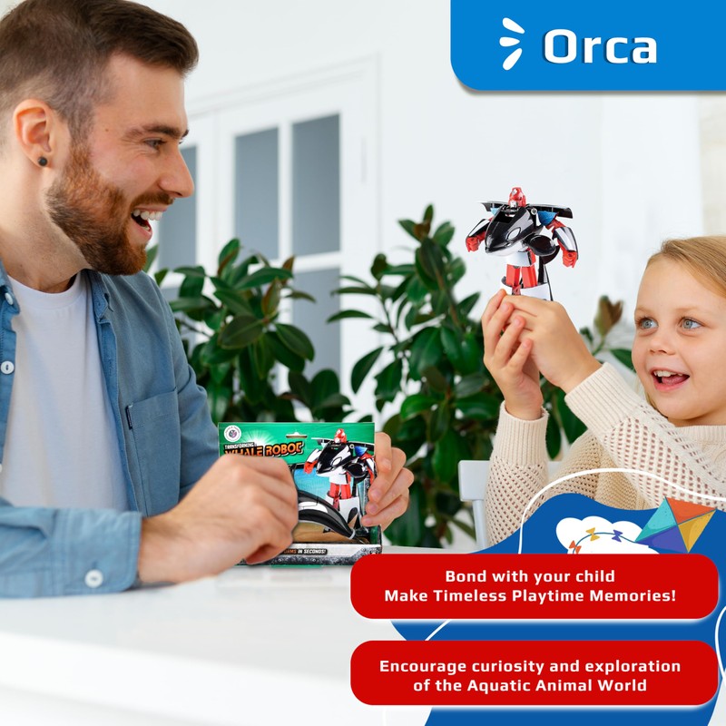 - TRANSFORMING ROBOT ORCA – Watch your child’s eyes widen in amazement as they discover the hidden secrets this Orca animal toy holds. By moving its pieces around, it transforms into a fully articulate and powerful robot toy.