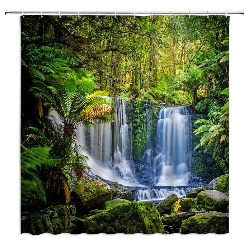 Forest Waterfall Shower Curtain Green Tropical Forest Waterfall Jungle Nature Scenery Landscape Bathroom Decor Curtain with Hooks,70Wx70H Inches