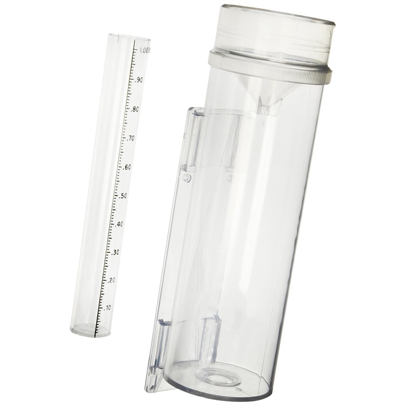 - Collects rain in top, funnels it to removable inner tube graduated in easy to read characters