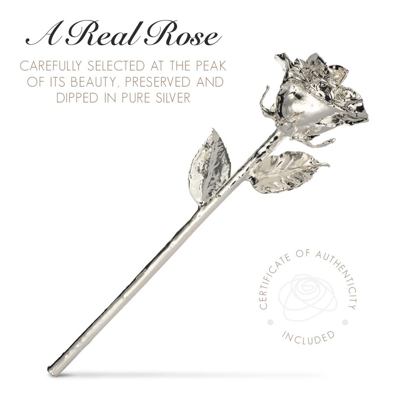 - Silver Rose - Hand-dipped in silver for a truly elegant, luxurious finish, each eternal flower measures 11-12 inches in length; Its bright, lively silver coating makes this rose truly one of a kind