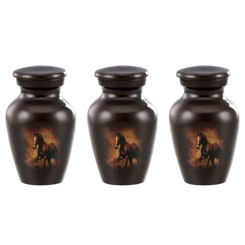 Forever URNS Mini Cremation Funeral Urn with Printed Running Horse Theme for Human Ashes of Female & Male | 3 cu in | Set of 3 | Small | Dark Brown | Completely Handcrafted with Velvet Protection Box