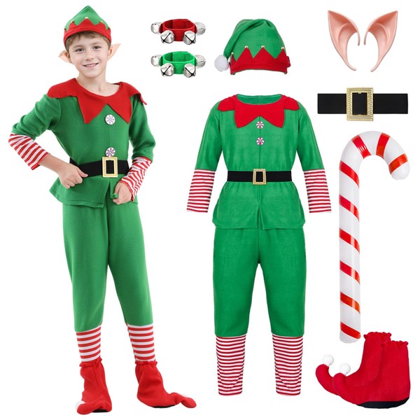 - [7Pcs Including]: This Christmas Elf Costume set for boys includes Elf Hat+ Elf Ears + Green Jacket + Green Pants + Belt + Shoes Cover + Inflatable Crutches.