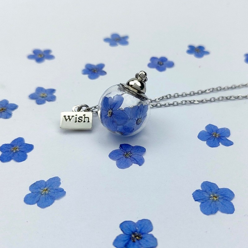 - Materials: Me forget-opinion flowers dried in a glass ampoule with a diameter of 2 cm, steel chain 45 cm + 5 cm. The clear glass lets you admire the beauty of the flowers inside, while the necklace itself with its elegance suits any occasion.