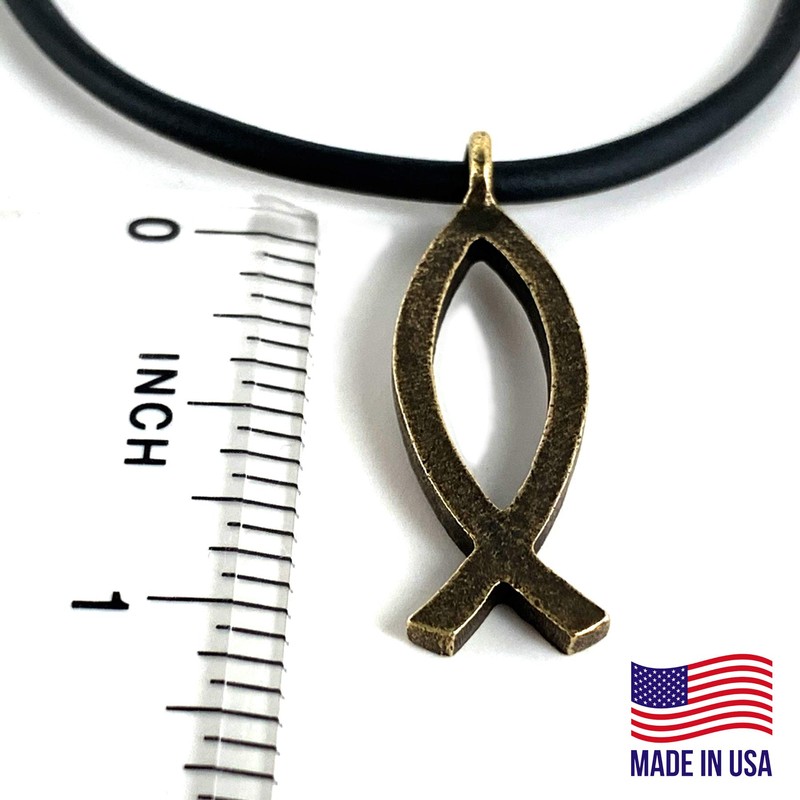FORGIVEN JEWELRY Jesus Fish Ichthus Pewter Antique Brass Metal Finish Black Cord Necklace