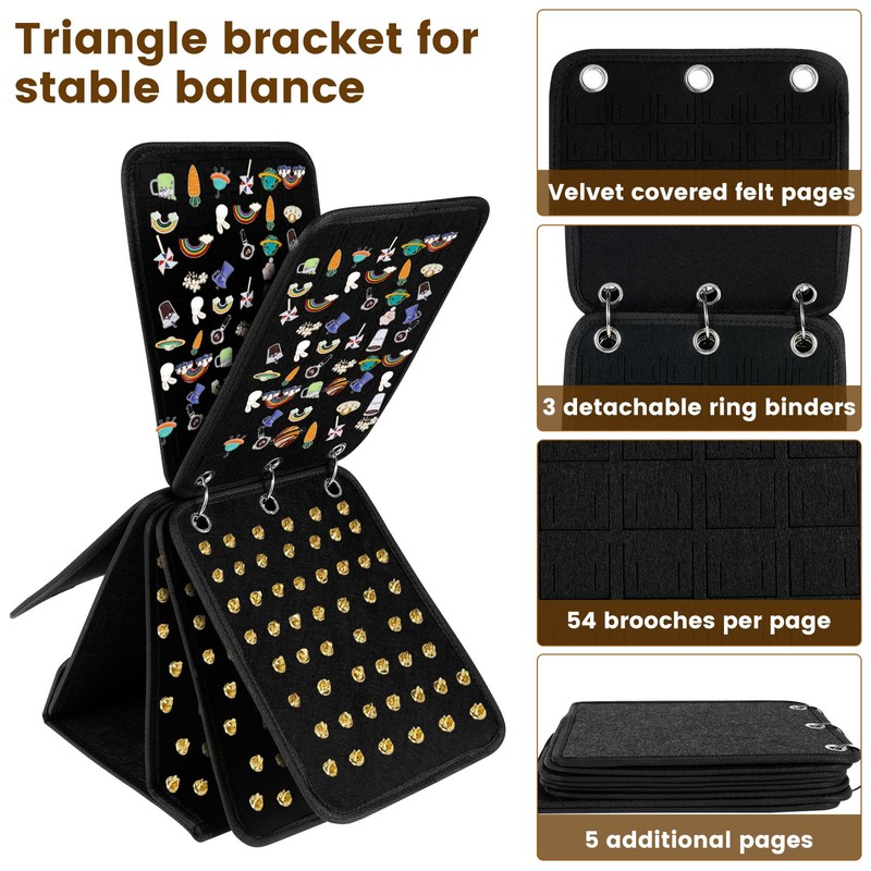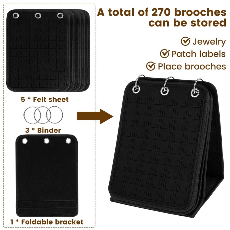 - [Store 270 Pins] This brooch display rack has 3 removable ring binders, 5 felt pages, each page can store 54 pins, and store a total of 270 pins. It can help you easily organize and place different sizes of pins, brooches, patch tags, jewelry and more.