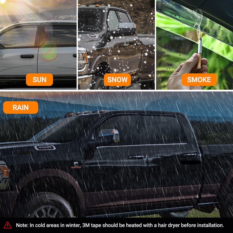 - 【Perfect Fit】Engineered exclusively for 2019-2024 2025 Dodge RAM 2500/3500 Crew Cab, Mega Cab (4 Full - Size Doors). With 3D laser-scanned curvature, these window visors ensure a seamless, factory-like fit for a sleek and secure installation. Notice: Regular Cab (2 Doors Only) and Quad Cab (2 Full-Size Front Doors & 2 Half-Size Rear Doors) are not applicable.