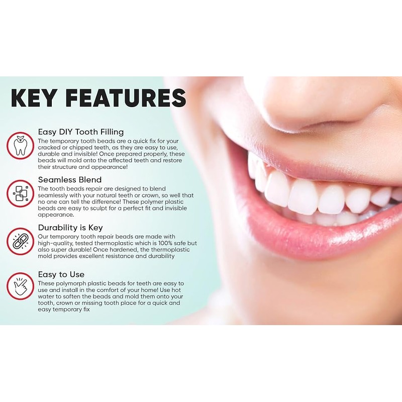 - Easy DIY Tooth Filling: The temporary tooth beads are a quick fix for your cracked or chipped teeth, as they are easy to use, durable and invisible! Once prepared properly, these beads will mold onto the affected teeth and restore their structure and appearance!