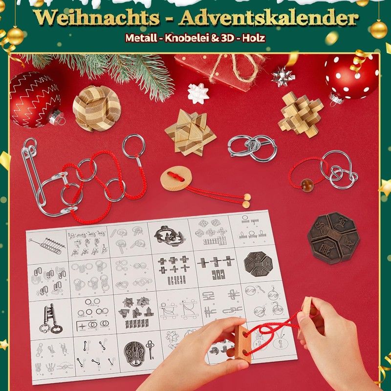 - Advent calendar 2025 - A new surprise every day: the anticipation of Christmas has never been so exciting! With our puzzle advent calendar you can open 24 doors full of surprises: 16 robust metal puzzles and 8 high-quality wooden puzzles are waiting to be discovered. Each day brings a new puzzle adventure that challenges patience, concentration and logic. A 2025 Christmas calendar that delights children and adults alike.
