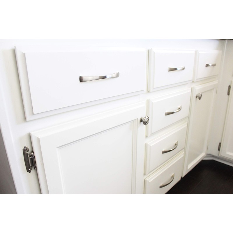 - Brushed satin nickel cabinet hardware knobs: Mushroom style or Multi-Ridged Ring Style.