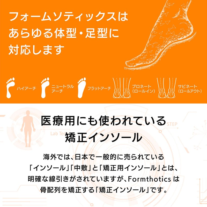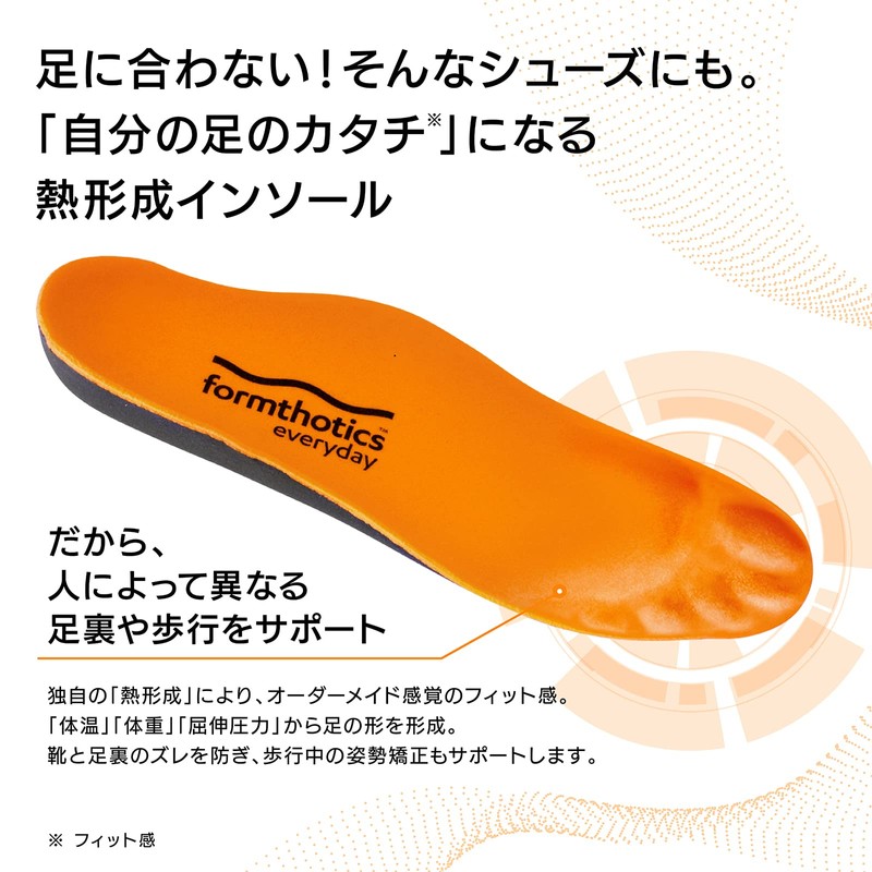 ■Orthopedic insole based on cutting-edge foot medicine that can be used for everyday shoes. ■ Foamsotics boasting overwhelmingly proven in New Zealand, which is the leading edge in foot medicine, is sold only by foot diseases. This is an authentic product for Japan. ■ Unlike ordinary insoles, this insole is designed to correct the legs and hips into a neutral position rather than protecting the legs from impacts. ■ Depending on the effect of the body temperature and weight, it can fit the shape of your foot precisely in about two weeks. This allows foam sotics to provide seamless support for the arch and heel for maximum effect. ■ By continuously using your favorite shoes, the natural and lower legs are corrected in a neutral position. ■ We have a variety of foam sotics according to the shape and size of the shoes. ■ Unlike injection moldings like other products, we have created a unique process that gently shaved from the lumps of raw material, which is the most important and extremely lightweight insole. ■ Anti-microbial treatment (Ultra-Fresh) prevents odor and prevents the growth of fungal and fungi. ■Recommended usage time 600km - 1000km or 1 year.