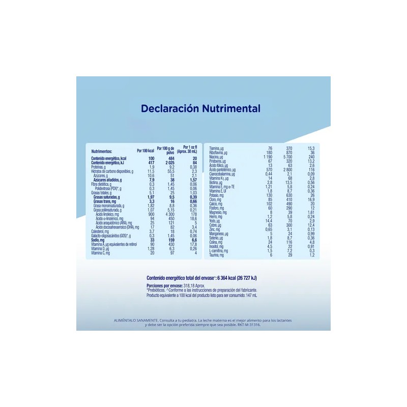Con DHA (Ácido Docosahexanoico), una mezcla de prebióticos GOS y PDX, vitaminas y minerales.