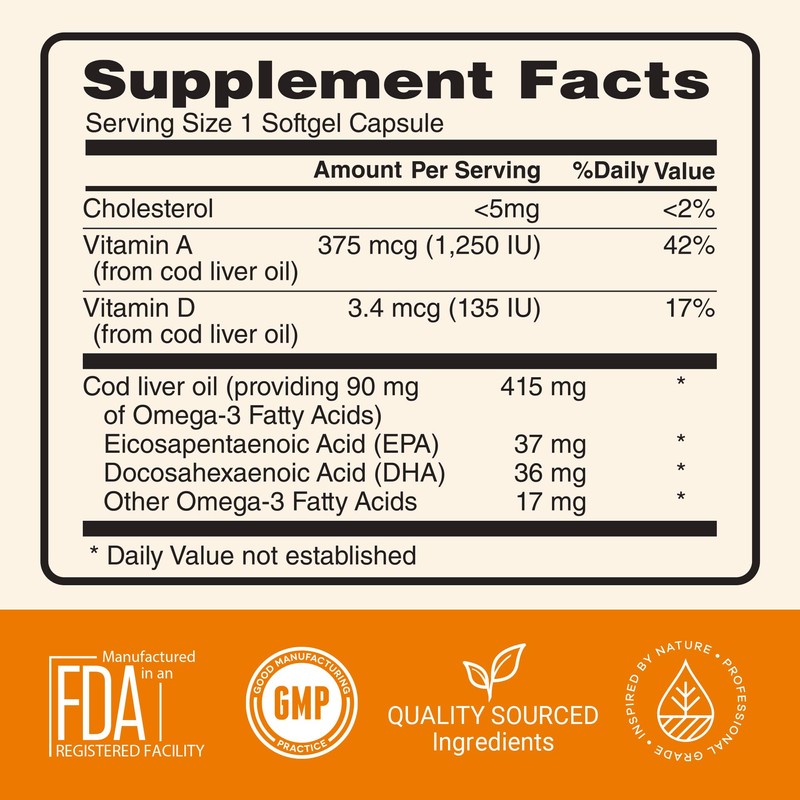 - 💊 EASY INTAKE: Opt for our easy-to-swallow cod liver oil softgels over traditional cod liver oil pills. As a dietary supplement, adults take 1 softgel capsule, 1 to 3 times daily with meals. Designed to integrate seamlessly into your daily routine, these softgels make it easier than ever to receive the benefits of cod liver oil.