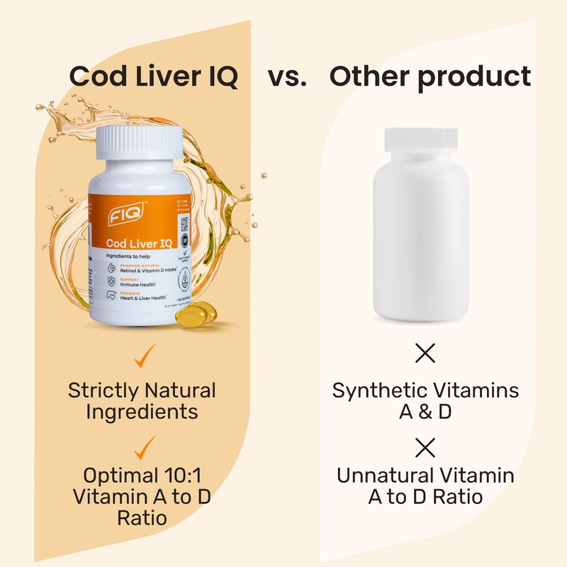 - 🌟 VITAMINS A & D, AS NATURE INTENDED: Formula IQ's Cod Liver oil features a balanced dose of Vitamins A & D at a 10:1 ratio. Each serving of our cod liver oil softgels delivers an incredibly nutritious profile of the naturally occuring vitamins found within Cod liver. This perfect balance not only enhances your vitamin intake, but also promotes heart & liver health while supporting immune system function.