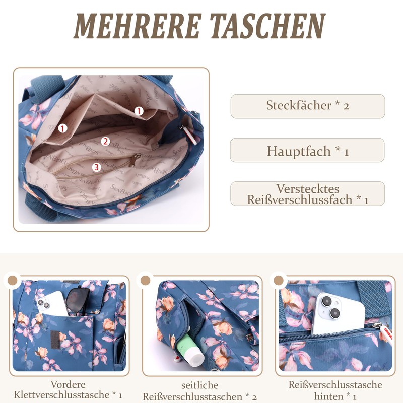 - ❤ Design with multiple pockets: 29 x 12 x 26 cm (length x width x height). 2 main pockets, 2 zip pockets; Front: 1 Velcro pocket; Back: 1 zip pocket; Side: 2 pockets. Weight: 0.52 kg. Multi-pocket for easy storage of your travel and daily necessities such as wallets, documents, iPads, parasols, cosmetics, etc.