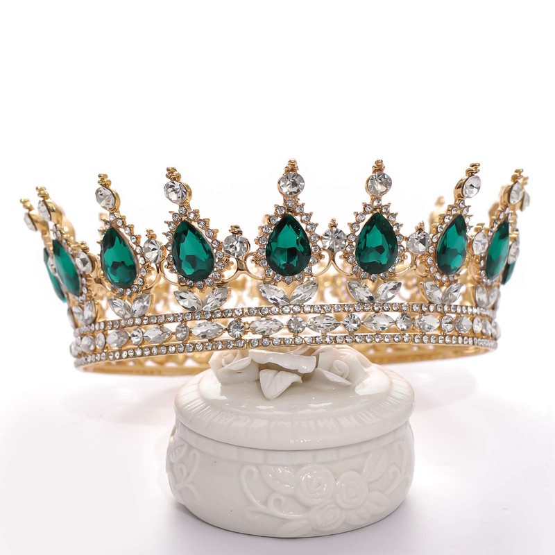 FORSEVEN Queen Crown Rhinestone Wedding Crowns and Tiaras for Women Costume Party Hair Accessories Princess Birthday Crown Crystal Bridal Crown (Gold+Green)