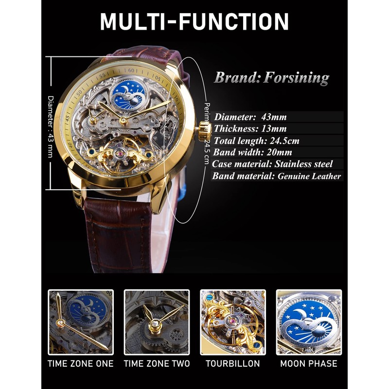 - 【MULTI-FUNCTION】Luxury hollow skeleton dial, the upper part is the moon phase function, the below part is the tourbillon, and the left side is the dual time zone function. It is a luxury automatic mechanical watch with the ultimate function. Pull out the crown, rotate clockwise to adjust the time of the time zone one, rotate counterclockwise to adjust the time of the time zone two.