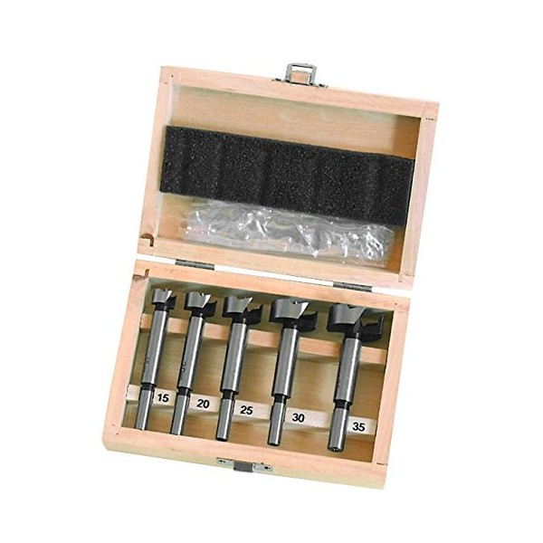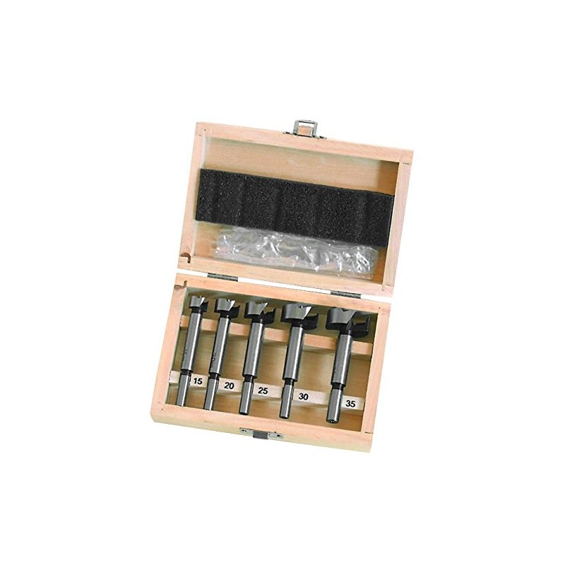 Forstner Bit Set 5 Piece Set Contents: Description: High quality alloy steel bits. Sizes: 15, 20, 25, 30 and 35 mm. In a wooden case.
