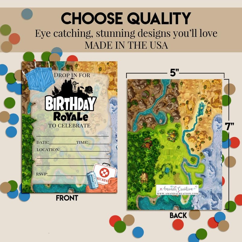 - Video Game Overload: Designed by a talented mom, these colorful cards feature a fun gaming map background with accents from your favorite fort battle video game. Your squad will love joining you for your video game themed birthday party. Amanda Creation. Original design by Amanda Creation
