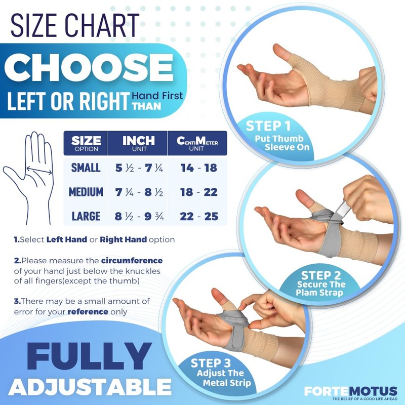 - 👍 Alleviate Thumb Discomfort with FORTEMOTUS — Our thumb brace offers a sanctuary for sore thumbs. Whether you're battling arthritis, ligament instability, tendonitis, or simple sprains, the FORTEMOTUS thumb brace is your ally. It braces your thumb, providing the stability needed for healing while offering enduring comfort.