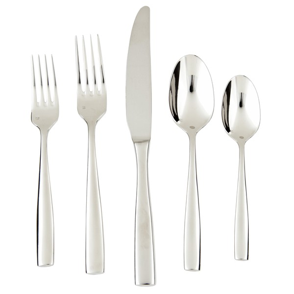 • 5 piece set includes: table fork, salad/dessert fork, table knife, dessert/soup spoon, coffee/ tea spoon; features heft, weight and balance in hand