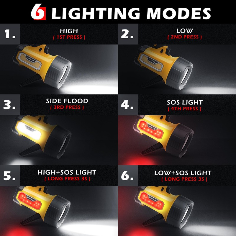 - 【6 Lighting Modes】 Featuring 6 distinct lighting modes, including high, low, flood, red emergency, high+red emergency, and low+red emergency settings, this rechargeable spotlight can adapt to a wide range of situations, from search and rescue operations to camping and outdoor activities, providing the right lighting for every task.