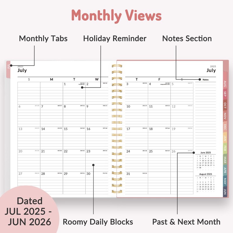 - 12-Month Coverage: This planner covers 12 months, from July 2025 to Jun 2026. Featuring both monthly and weekly pages, it helps you stay on top of your schedule. A must-have for anyone looking to manage time effectively and stay organized.