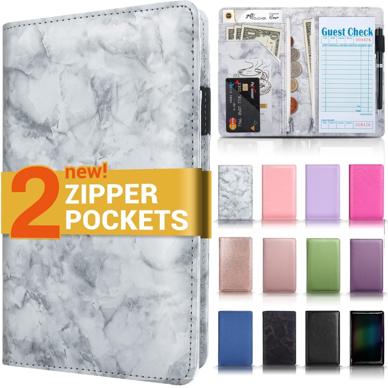 Forvencer Server Book with 2 Zipper Pockets, Leather Server Books for Waitress, Waiter Book, Sturdy Waitress Book with Money Pocket and Zipper, Servers Book Waitress Accessories Fit Server Apron, Marble Grey