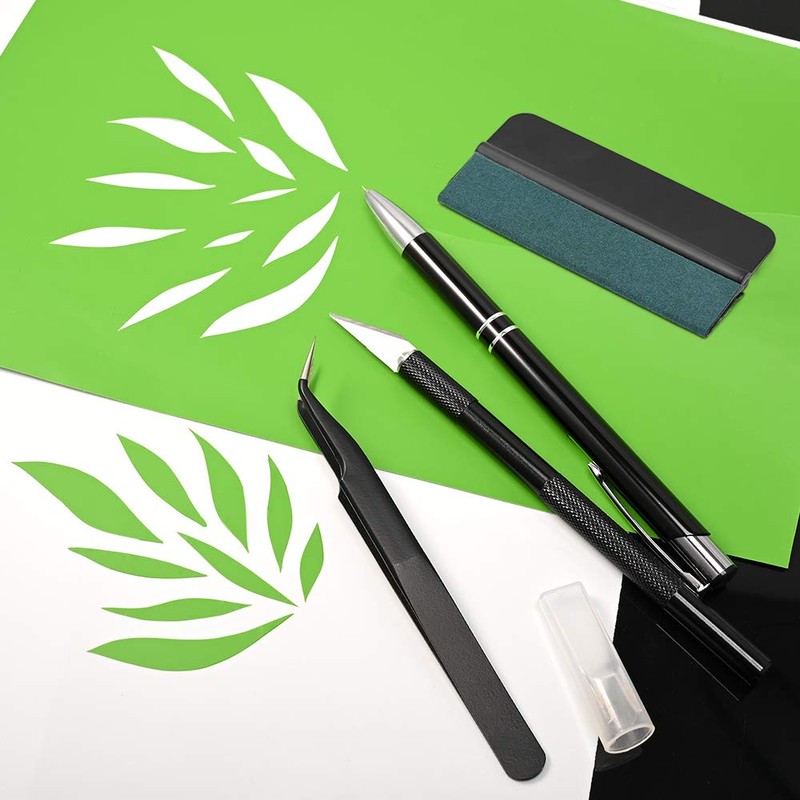 • 【Craft Vinyl Tools Set 】1pcs reverse grip tweezers, 1pcs scissors free cutter, 1pcs felt squeegee ,1pcs crft vinyl pin pen and replacement pin, and 1pcs craft cutter with 5 blades.