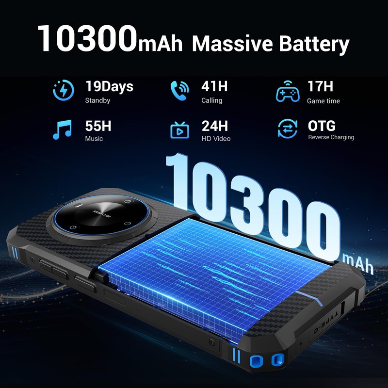 - 10300mAh Massive Battery & Reserved OTG Charging: FOSSiBOT F105 rugged mobile phone is equiped with 10300mAh battery and 10W fast charging.With up to 19 days standby time /41 hours of talking / 55 hours of music playback / 24 hours of video playback. This Android 14 cell phone unlocked also supports OTG reverse charging, allowing you using outdoors as an emergency backup power for other devices via this rugged phone. It‘s a good choice for outdoor explorers and workers.