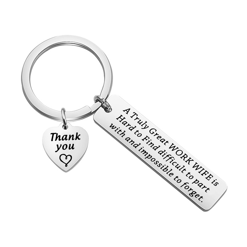 - The keychain is engraved with"A TRULY Great WORK WIFE is Hard to Find difficult to part with and impossible to forget"and"Thank you".