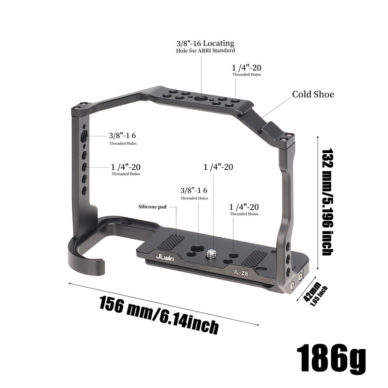 - Multiple mounting points: the Z8 cage has several 1/4 inch - 20 holes, 3/8 inch -16 holes on the top and one side for ARRI, supporting different types of top handles or side handles. Also bulit-in a cold shoe mount on top for microphone, LED lights or the mounting bracket.