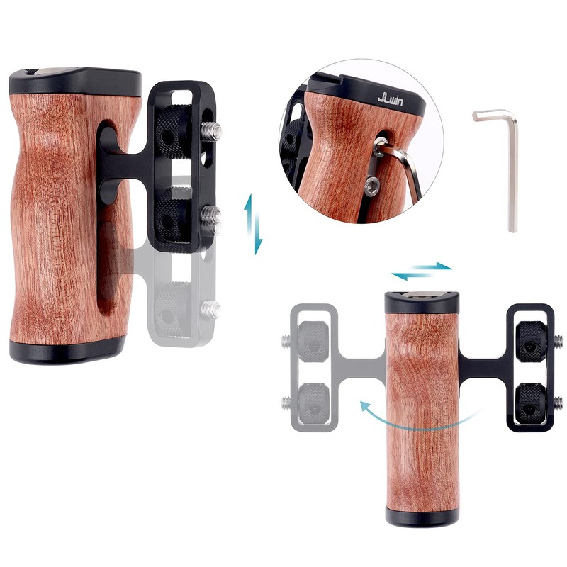 - The universal wooden side handle grip is compatible with DSLR camera cage on the market.